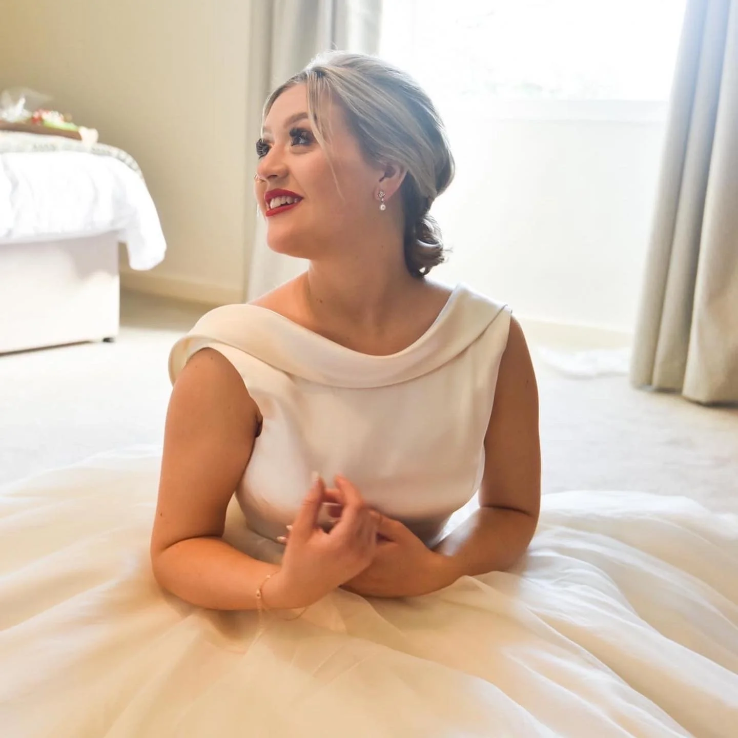 The photograph of Meg sitting on the floor of the manor house bedroom getting ready to put on her shoes. The elegant pose with her face looking towards her mother shows happiness and love towards her. Her hands nearly interlocking into one another towards her chest allows the skirt of the dress to sit draped over her legs freely.
