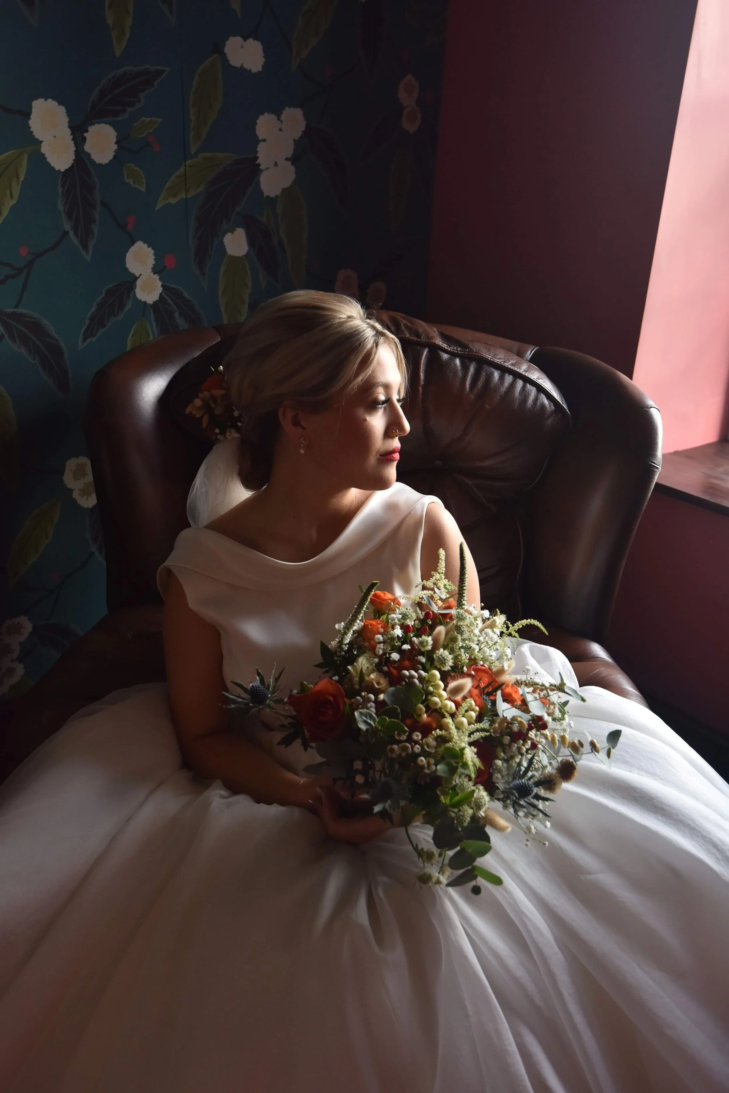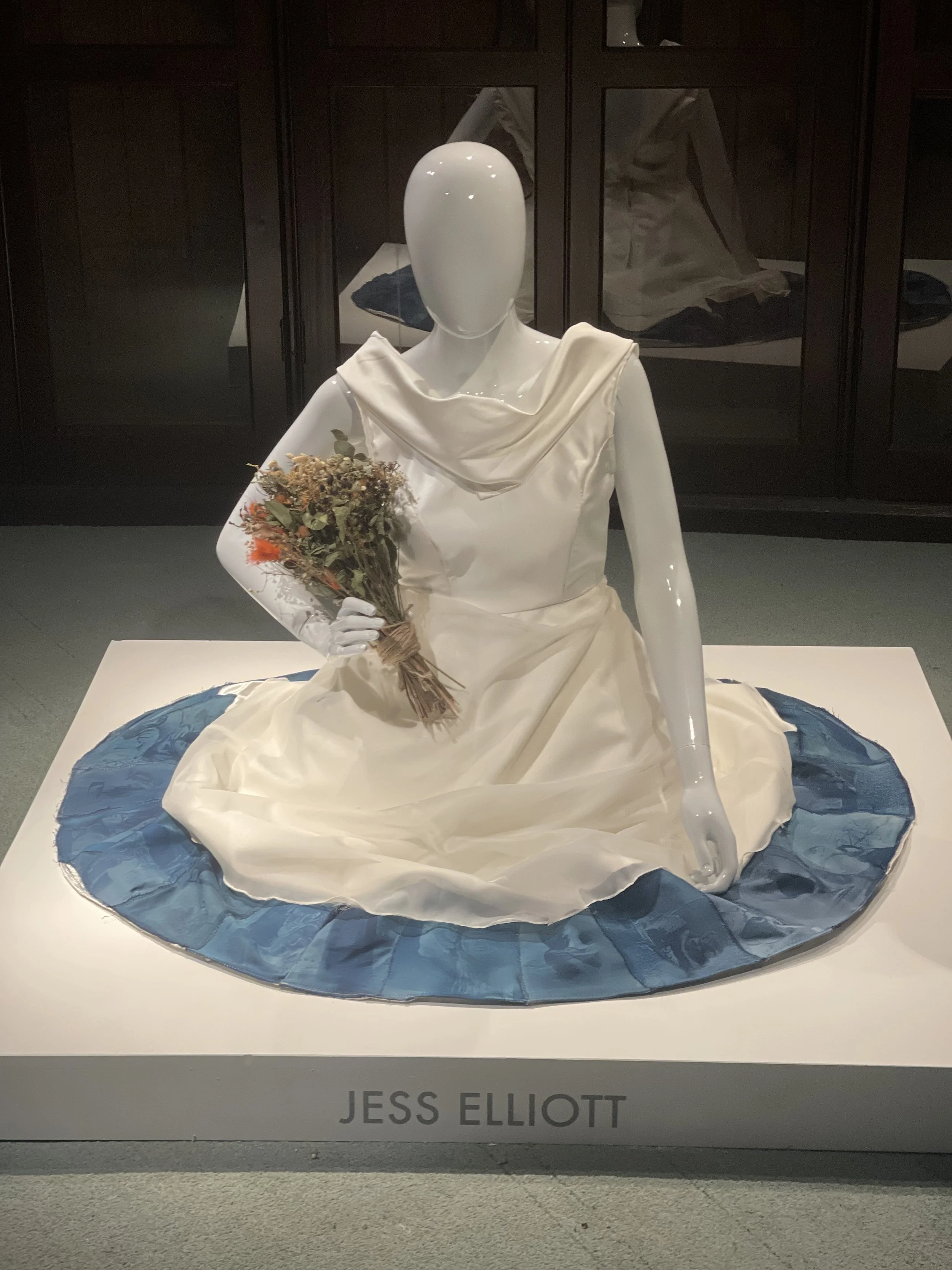 Adding the plinth and the flowers created more of an aesthetic of a wedding dress. Adding Meg’s dried bouquet of flowers created more of a look and feel of a wedding, and the positioning of the arm on the mannequin allowed for this to look successful.